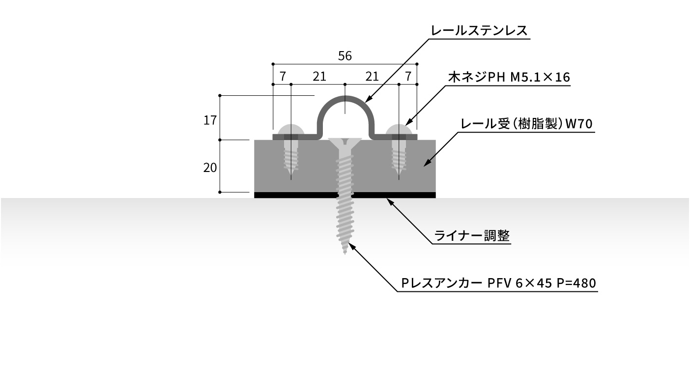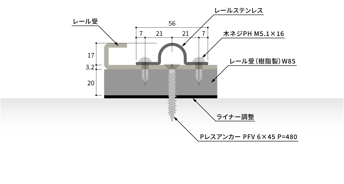 埋込式レールに、下部転倒防止を付けたレール構造です。