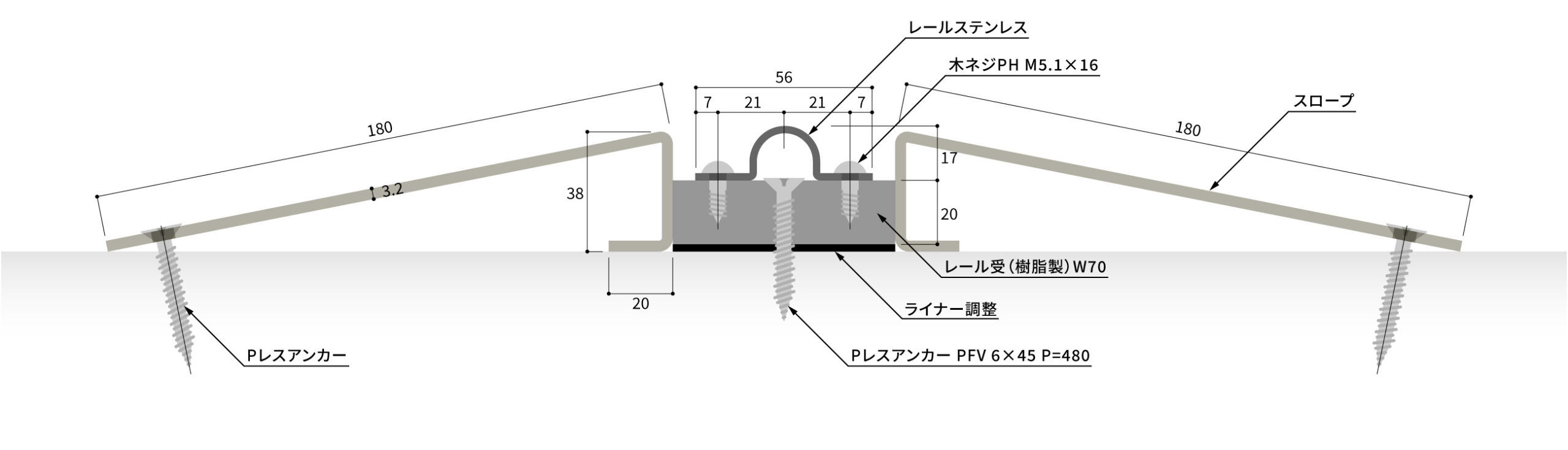 標準レールの両際に、オプションのスロープを取付けをした断面図です。